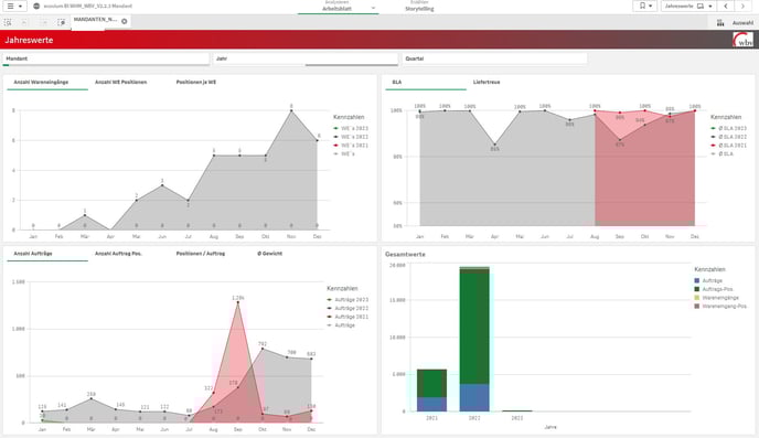 Das BI-Tool umfasst die Prozesse Wareneingang, Retouren, Liefertreue, Artikelbestand mit Historie, Datenqualität der Aufträge und des Artikelstamms, als auch einen Jahresvergleich.
