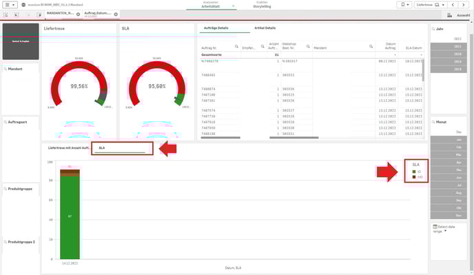 Wählt man die rote Legende aus, werden die Aufträge angezeigt, die das SLA nicht erfüllt haben.